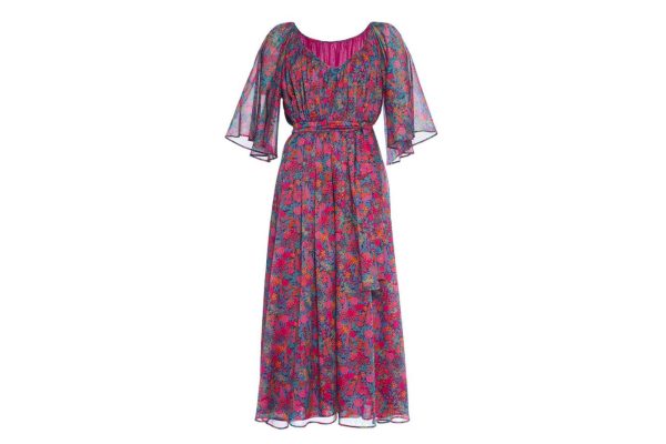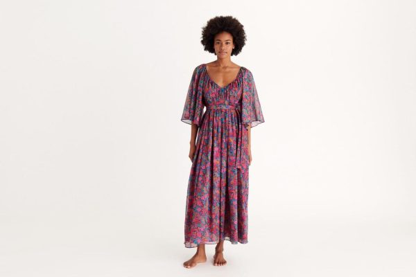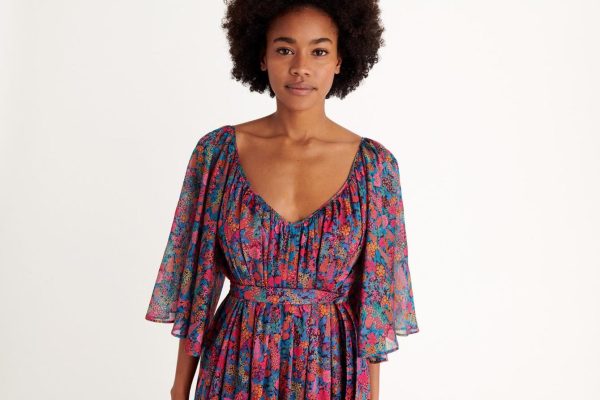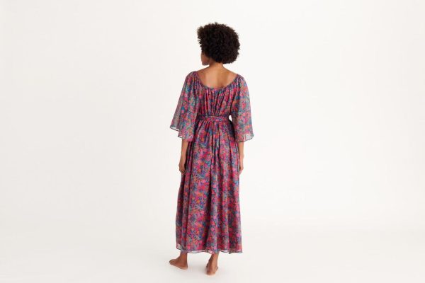The Daisy long dress showcases a captivating liberty print in vibrant electric colors that evoke the magical atmosphere of a moonlit garden. Crafted from premium cotton, it features elegant sheer butterfly sleeves and a removable belt that enhances your feminine silhouette.