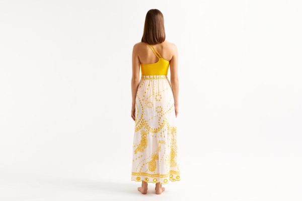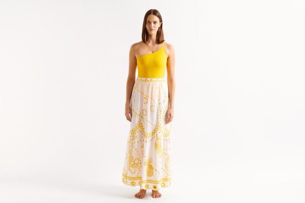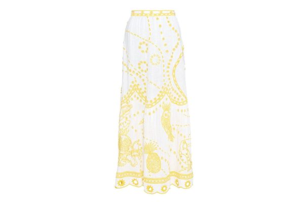 The long Ambra linen skirt embroidered with tropical motifs is inspired by a colourful, celebratory atmosphere and features sophisticated transparent details. With its openwork scalloped bottom, it boasts subtle and refined finishes that make it an exceptional piece.