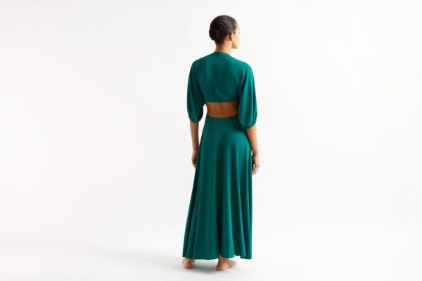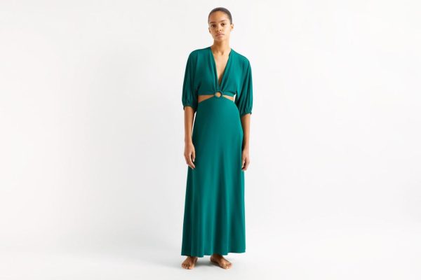 The Carmen long dress is made of jersey, a comfortable fluid material and icon of the ERES Maison. A ring under the bust gathers the waist and the top of the skirt, both elasticated, embellishing the skin like jewellery. Its mid-length sleeves are also gathered at the bottom. An elegant piece to wear day and night.