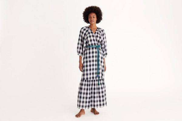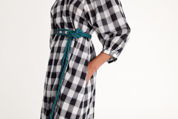 Inspired by a kimono, the long Chess dress features a two-tone twisted tie belt in Peau Douce at the waist. This lightweight and sophisticated piece is made in a cotton voile, ideal for the beach or town.