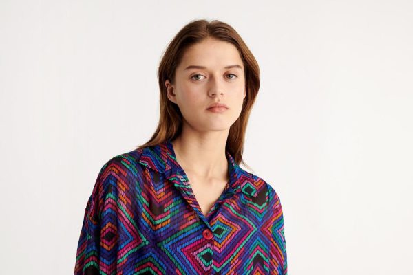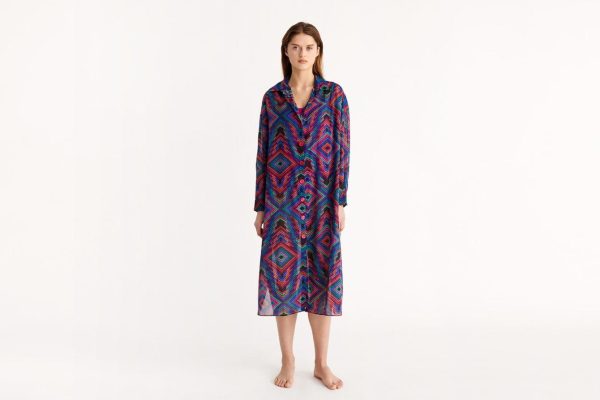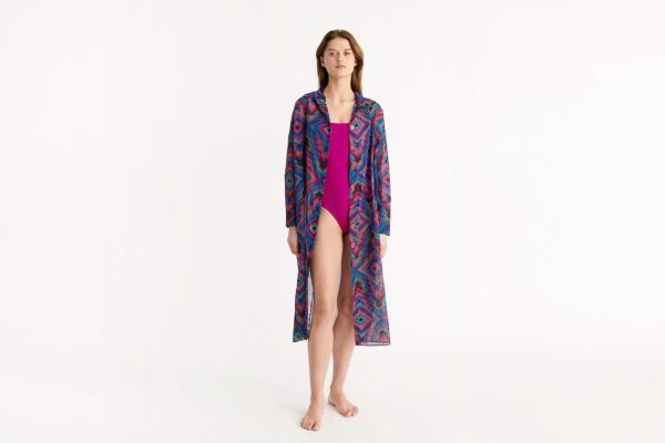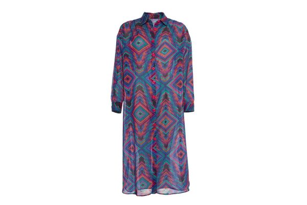 Made of cotton voile, the long DJ shirt is light, comfortable and slightly sheer. It features the Arc-en-Ciel print, with hypnotising geometric motifs inspired by ethnic designs. Contrasting coloured buttons elevate the piece.