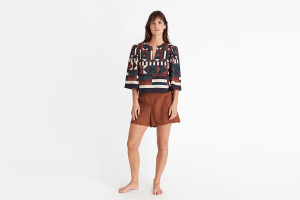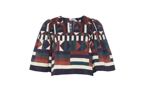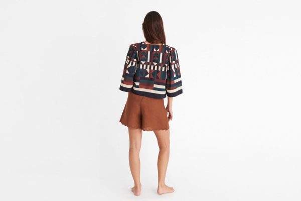 The Lunaire top is contemporary, feminine and elegant all in one. This cropped, breezy style features loose 3/4-length sleeves, gathered shoulders and a low-cut V-neck front for a flirty finish. The colourful patchwork-inspired pattern is a nod to Mexican style and ethnic vibes.