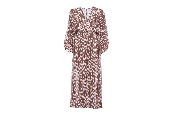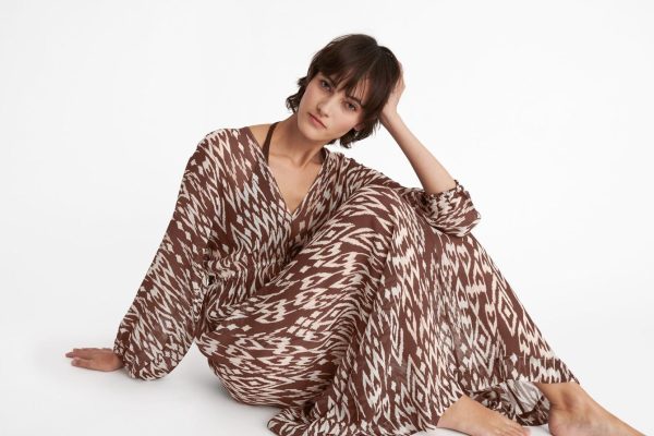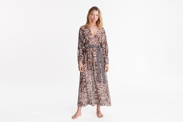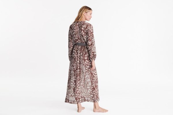Brimming with femininity, the long silk crepe Sky dress features an ikat-inspired print. Long sleeves add an elegant touch, whilst an elasticated waist accentuates the silhouette. A removable striped belt adds a playful twist.