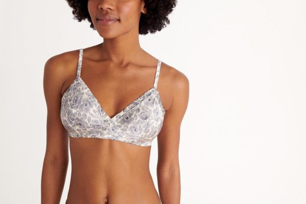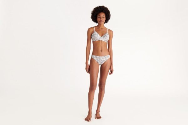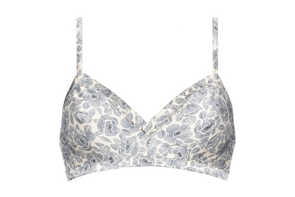 In a toile de Jouy style, the Cueillette triangle bra features a soft floral motif on delicate silk satin. Its elasticated chest band ensures comfort and support from this refined vintage piece.