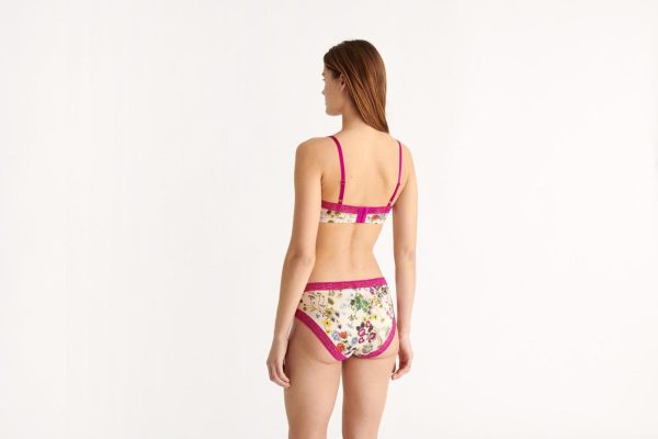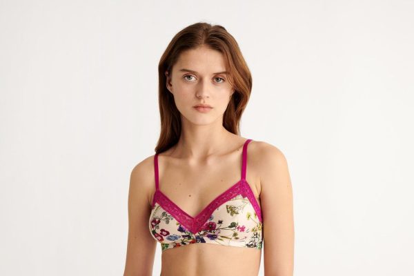 The Figuier wireless triangle bra in silk twill features a floral print on a delicate vanilla background creating a botanical theme. This comfortable bra with its elastic chest band is enhanced with Freesia pink lace edging.