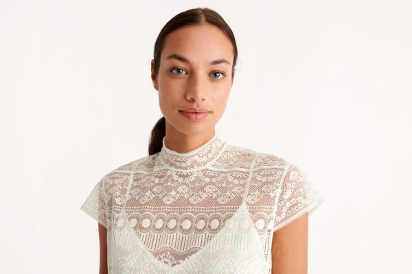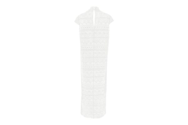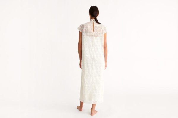 An exceptional piece, the long Exquise dress is made entirely from floral jacquard lace. It features elegant details like a high neck and satin-covered buttons on the back. Small sleeves sit delicately on the shoulders.