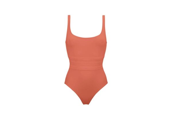 This tank one-piece swimsuit, available in this season’s colours, has broad straps and a round neckline. Its waist panel, which is both graphic and practical, sculpts the figure and suits all body shapes.