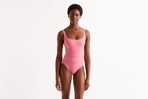 This tank one-piece swimsuit, available in this season’s colours, has broad straps and a round neckline. Its waist panel, which is both graphic and practical, sculpts the figure and suits all body shapes.