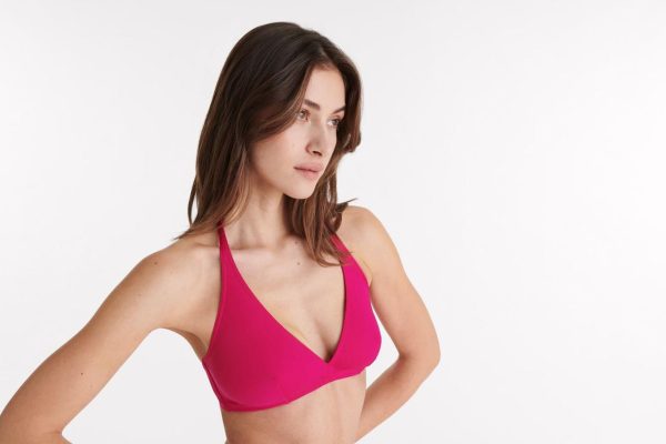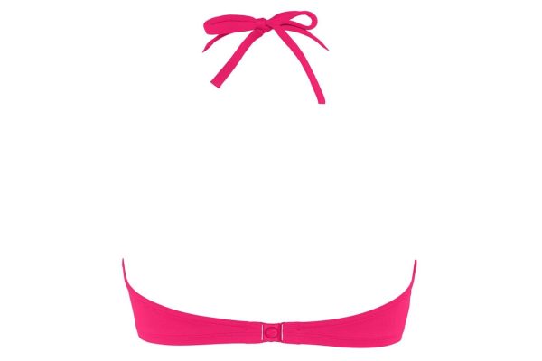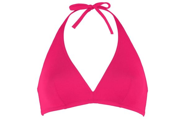 This full-cup triangle bikini top with thin straps to tie around the neck has bust darts and side stays for good support. It is especially suited to generous busts.