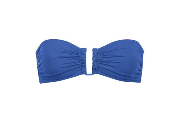 Experience the ultimate in sophisticated swimwear with this underwire-free bandeau bikini top, featuring a distinctive U-shaped metal link that elegantly separates its pleated cups while side stays provide exceptional support and shape retention.